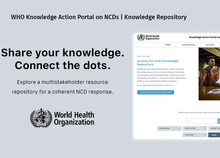 The Knowledge Action Portal on NCDs (KAP) is a knowledge sharing and community platform dedicated to enhancing NCD prevention and control through multisectoral and multistakeholder collaboration. The KAP is hosted by the World Health Organization’s Global Coordination Mechanism on the Prevention and Control of Noncommunicable Diseases (GCM/NCD).